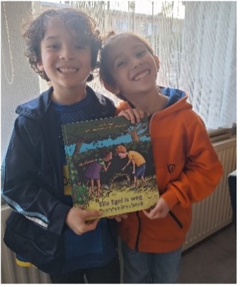 Een van de scholen liet weten dat de gedoneerde boeken gretig aftrek vinden. Daar leest een oudere leerling Ella Egel is weg voor aan twee kleuters, waarvan eentje het Nederlands al verstaat en begrijpt en zij voor de andere nog af en toe vertaalt. Wat een prachtige manier om het boek in te zetten en voor meerdere leeftijden tot een uitdaging te maken!
