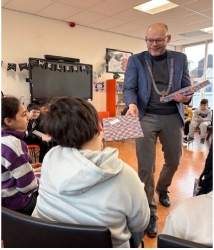 De feestelijke sfeer werd nog verhoogd doordat samen met de kinderen een Scholenschenking werd uitgepakt en de burgemeesters de kinderen ook nog eens op een eigen boek trakteerden.